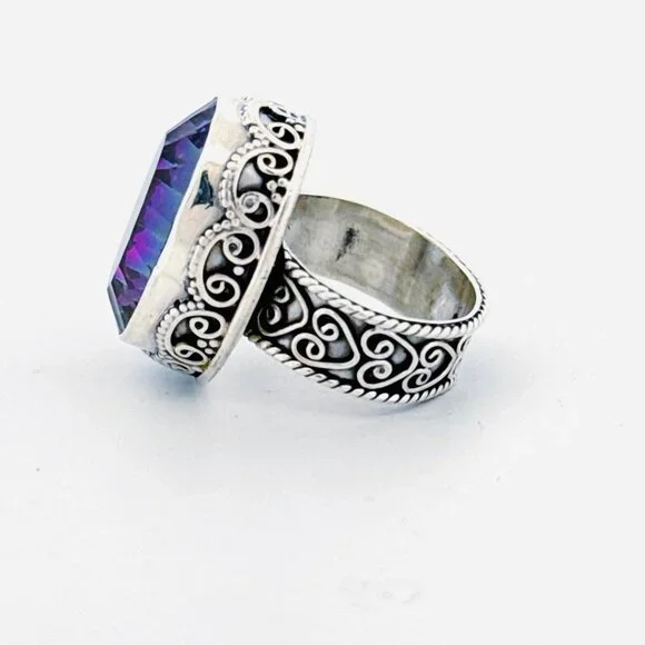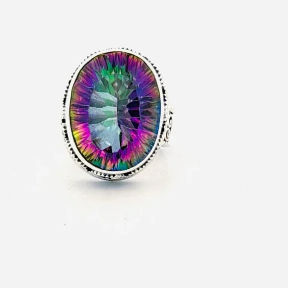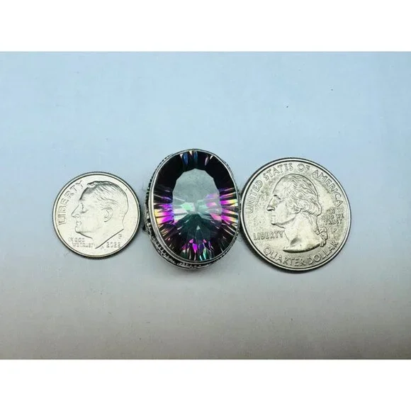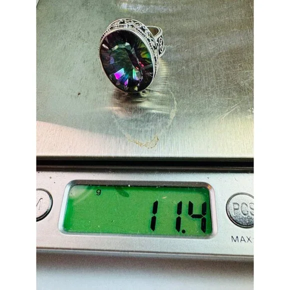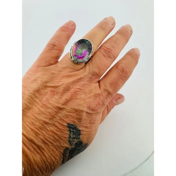"New Sterling Silver 925 Oval Bezel Set Mystic Topaz Chunky Statement Ring for Women - Size 6, 11.4g"Description:"Make a bold statement with this stunning Sterling Silver 925 women's ring, featuring a large, oval bezel-set Mystic Topaz. Designed for those who love unique and eye-catching jewelry, this chunky statement piece weighs 11.4 grams and is perfect for size 6. The detailed craftsmanship and the vibrant colors of the Mystic Topaz make this ring a must-have addition to any collection. Marked 925 for authenticity, this ring combines elegance with a touch of mystique."Features:• New Sterling Silver 925 Oval Bezel Set Mystic Topaz Chunky Statement Ring for Women - Size 6, 11.4gSize: Womens Size 6Condition: New Without Tags