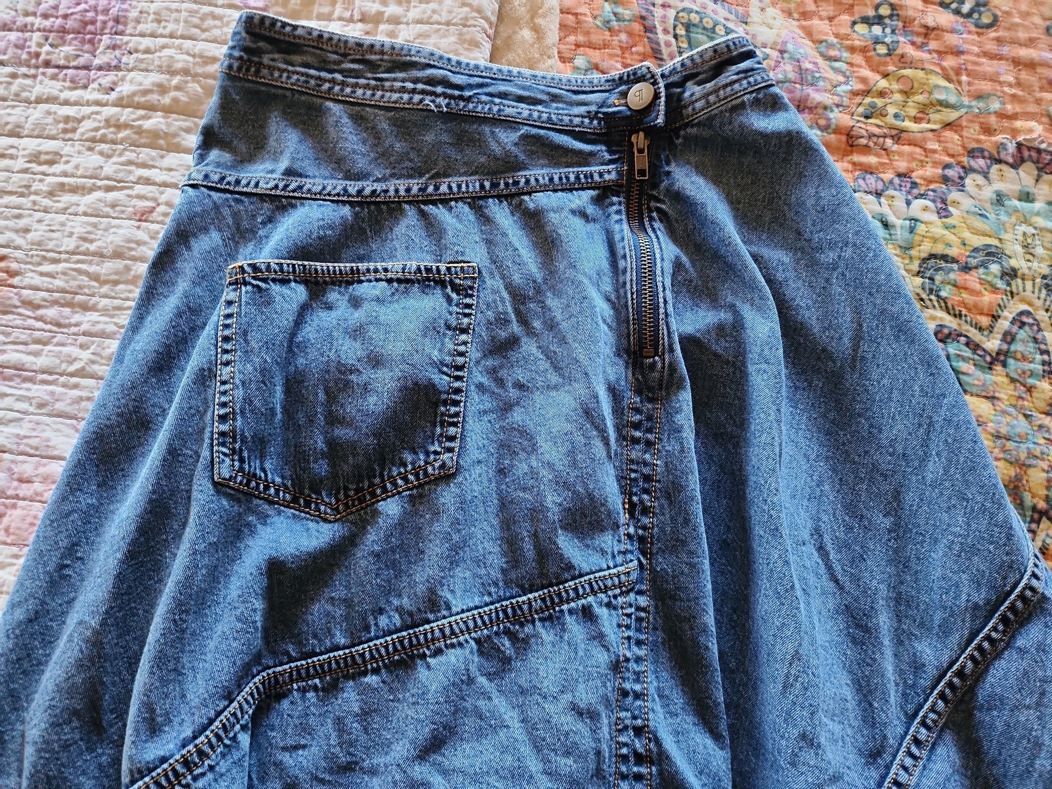 SOLD SOLD SOLD SOLD SOLD Anthropologie Pilcro Jean Skirt, 4. Asymmetrical, Zip & Button Closure, 1 Drop Pocket in Front, 2 Faux Pockets in Rear, Tailored Seams, Slimming Details, Very Lite Material, almost a Chambray. Approximate Measurements are Illustrated in Photos. While Hem is Asymmetrical, I have Measured both Longest and Shortest Points of the Skirt so you get an idea of what it will look like. This Skirt is Very Cool! I bought it for myself but have unexpectedly outgrown my size. The last pic is to give you a sense for the asymmetrical style, it is not the Pilcro Skirt you will be receiving. SOLD SOLD SOLD SOLD SOLD