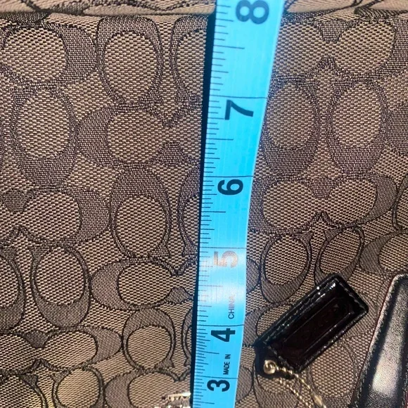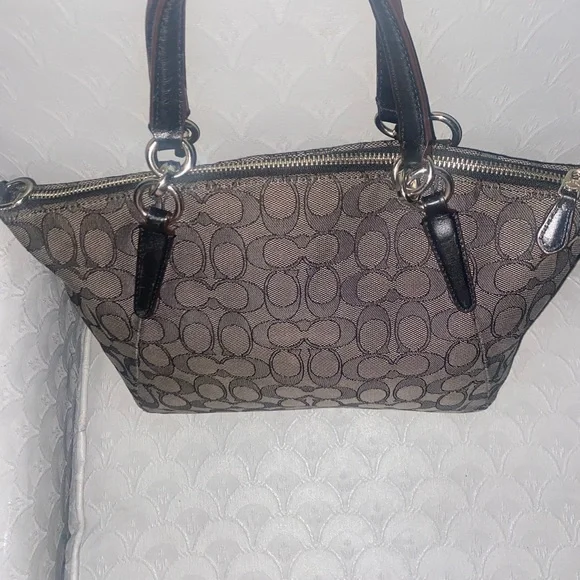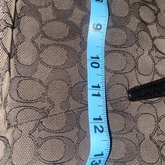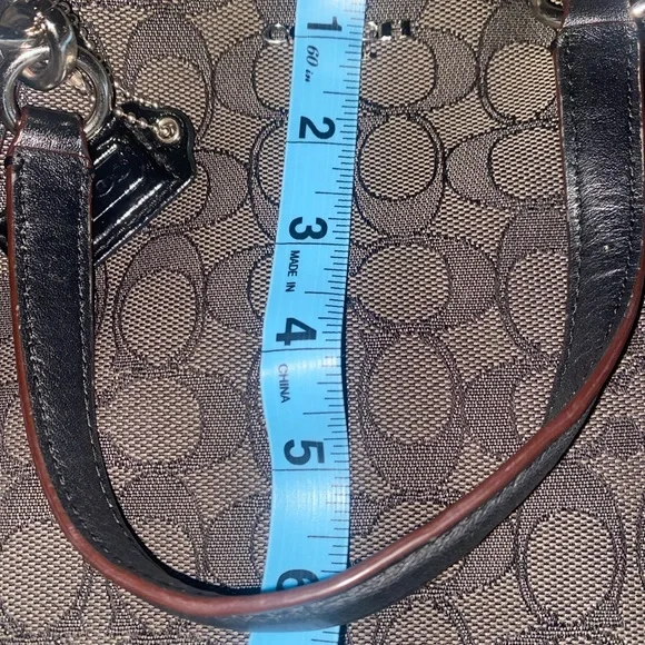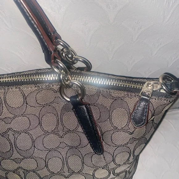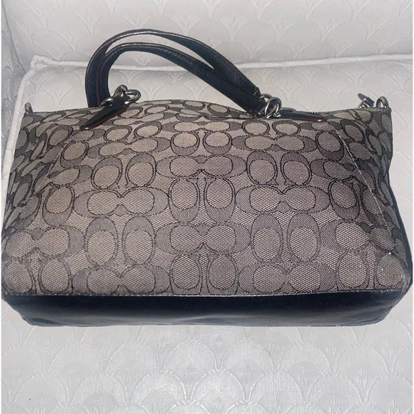In excellent used condition Hardware is labeled Coach it is so beautiful Black leather and smoke gray canvas 🤩No smells or corner tearsLeather and signature C canvassatchel leather handlesClean interior, one small scratch on the bottom cornerLeather bottomComes with a leather coach makeupBag and metal coach tag if paid asking price.